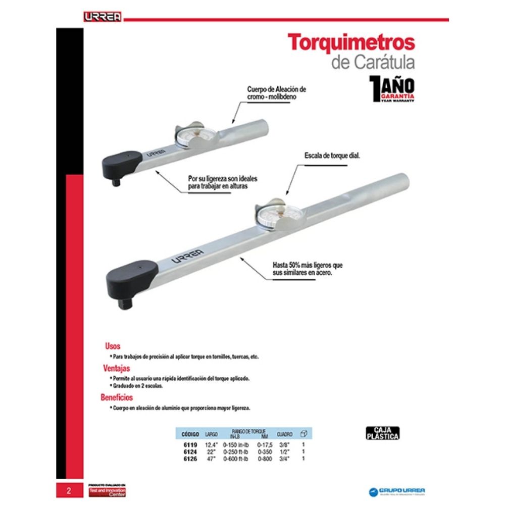 Torquímetro de carátula con cuerpo de aluminio cuadro de 3/4″, 120-600 ft-lb Urrea