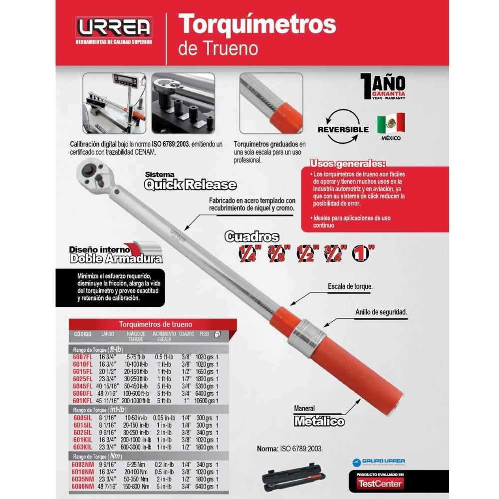 -Torquímetro de trueno una escala, mango metálico. Sistema Quick Release. Escala ft-lb. Largo 16 3/4″. Rango torque 5 – 75 ft-lb. Cuadro 3/8″