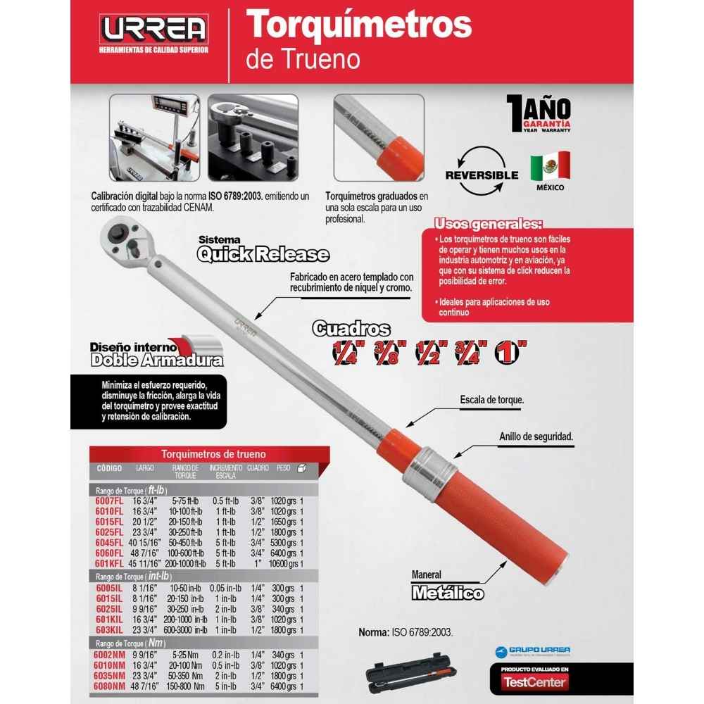 Torquímetro de trueno una escala cuadro de 3/8″, 5-75 ft-lb Urrea